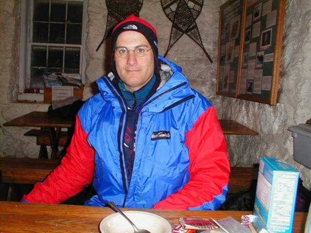 I found it amazing in this picture, that Cathy could be smiling. After all, it was 15 degrees Farenheit below zeow in this sleeping hut at the time of this picture. Jay kindly contributed his breath (the steam in the picture) to help illustrate the frigid temperature.